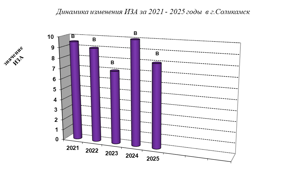 Общая оценка загрязнения атмосферы. В г. Соликамск за 2025 год уровень загрязнения атмосферного воздуха характеризуется, как высокий: СИ=7,4 (сероводород), НП=1,6% (оксид азота), ИЗА - высокий.