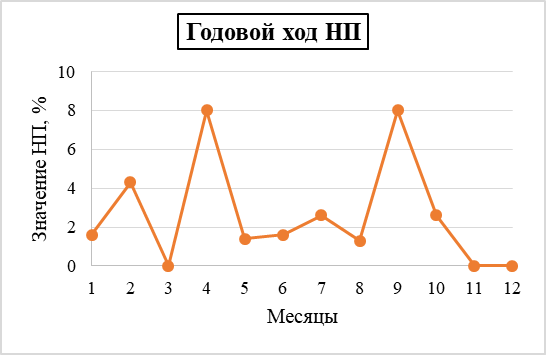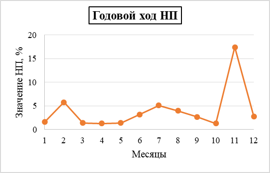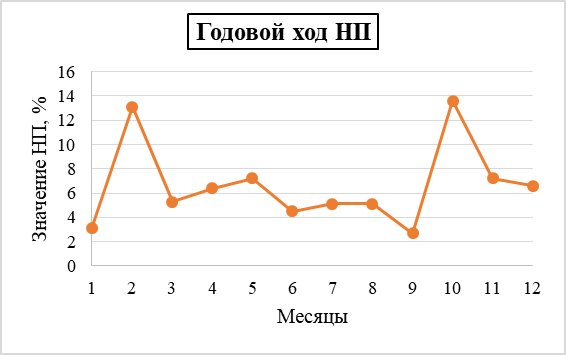 Годовой ход загрязнения атмосферы. В годовом ходе СИ и НП в Перми наиболее высокое значение СИ отмечено для этилбензола в октябре 2025 года – 4,4, самое высокое значение НП отмечено в октябре для этилбензола – 13,6%. (Данная информация предствлена графически).