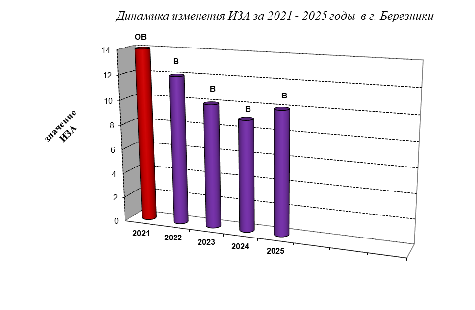 Общая оценка загрязнения атмосферы. В г. Березники за 2025 год уровень загрязнения атмосферного воздуха характеризуется, как высокий: СИ=4,1 (оксид углерода), НП=0,7% (оксид углерода), ИЗА - высокий.