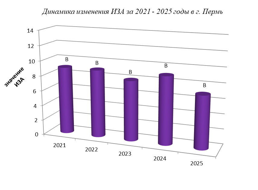 Общая оценка загрязнения атмосферы В г. Перми за 2025 год уровень загрязнения атмосферного воздуха характеризуется, как высокий: СИ=4,4 (этилбензол) – Мотовилихинский район, НП=3,4% (этилбензол) – Индустриальный район, ИЗА – высокий.