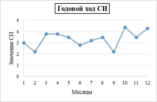 Годовой ход загрязнения атмосферы. В годовом ходе СИ и НП в Соликамске наиболее высокое значение СИ отмечено для сероводорода в сентябре 2025 года – 7,4 самое высокое значение НП отмечено в ноябре 2025 года для хлорида водорода – 17,4%. (Данная информация предствлена графически).