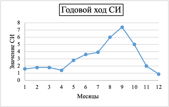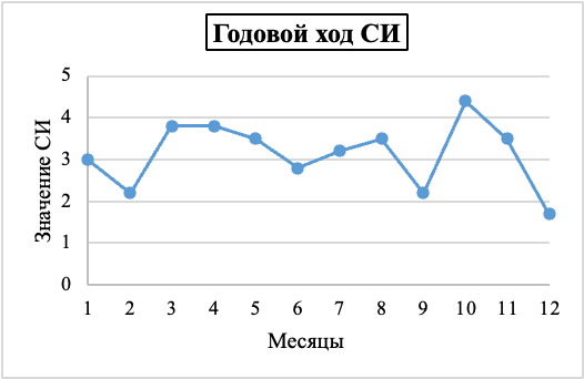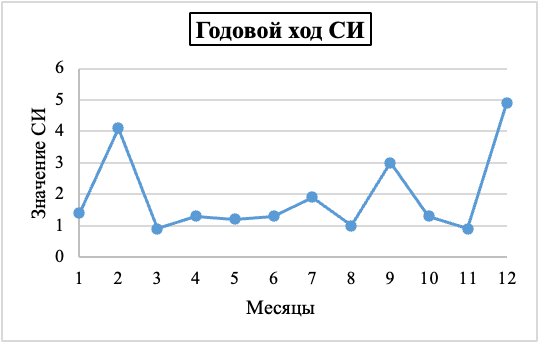 Годовой ход загрязнения атмосферы. В годовом ходе СИ и НП в Соликамске наиболее высокое значение СИ отмечено для сероводорода в сентябре 2025 года – 7,4 самое высокое значение НП отмечено в ноябре 2025 года для хлорида водорода – 17,4%. (Данная информация предствлена графически).