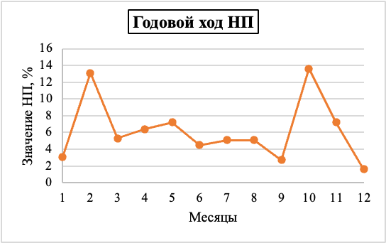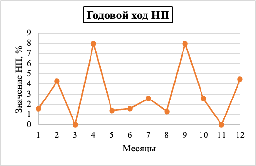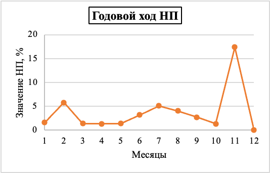 Годовой ход загрязнения атмосферы. В годовом ходе СИ и НП в Перми наиболее высокое значение СИ отмечено для этилбензола в октябре 2025 года – 4,4, самое высокое значение НП отмечено в октябре 2025 года для этилбензола – 13,6%. (Данная информация предствлена графически).