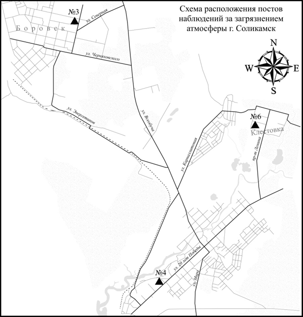 Наблюдения за загрязнением атмосферы. В городе Соликамск наблюдения производятся 3 постах по 24 веществам: взвешенные вещества, диоксид серы, оксид углерода, диоксид азота, оксид азота, сероводород, хлор, хлорид водорода, аммиак, формальдегид, бензол, ксилолы, толуол, этилбензол, бенз(а)пирен и тяжелые металл (хром, свинец, марганец, никель, цинк, медь, железо, кадмий, магний).