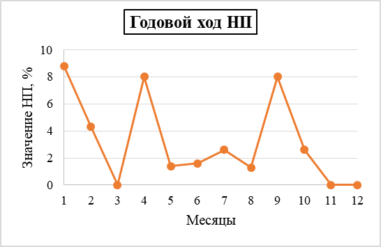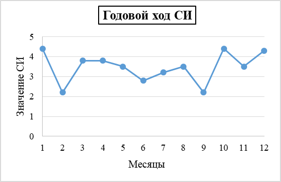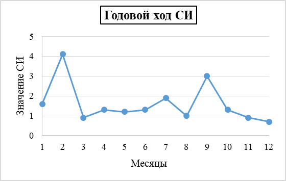 Годовой ход загрязнения атмосферы. В годовом ходе СИ и НП в Березниках наиболее высокое значение СИ отмечено для оксида углерода в феврале 2025 года – 4,1, самое высокое значение НП отмечено в январе 2026 для оксида углерода – 8,8%. (Данная информация предствлена графически).