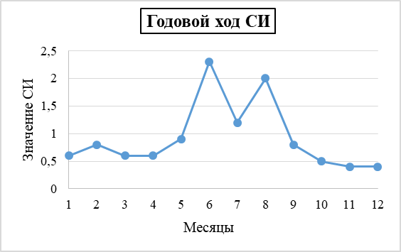Годовой ход загрязнения атмосферы. В годовом ходе СИ и НП в Соликамске наиболее высокое значение СИ отмечено для сероводорода в сентябре 2025 года – 7,4 самое высокое значение НП отмечено в ноябре 2025 года для хлорида водорода – 17,4%. (Данная информация предствлена графически).