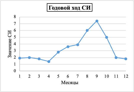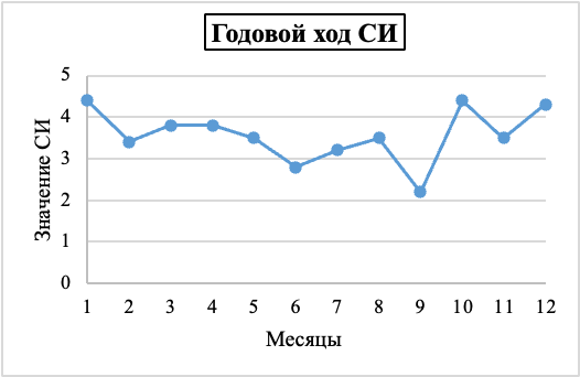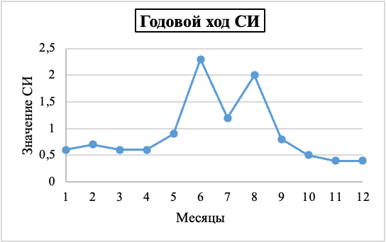 Годовой ход загрязнения атмосферы. В годовом ходе СИ и НП в Соликамске наиболее высокое значение СИ отмечено для сероводорода в сентябре 2025 года – 7,4 самое высокое значение НП отмечено в ноябре 2025 года для хлорида водорода – 17,4%. (Данная информация предствлена графически).