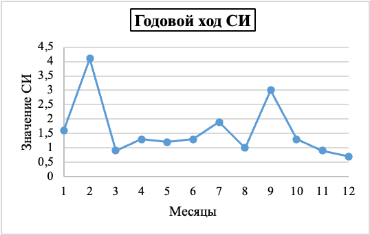 Годовой ход загрязнения атмосферы. В годовом ходе СИ и НП в Березниках наиболее высокое значение СИ отмечено для оксида углерода в феврале 2026 года – 4,3, самое высокое значение НП отмечено в январе 2026 для оксида углерода – 8,8%. (Данная информация предствлена графически).